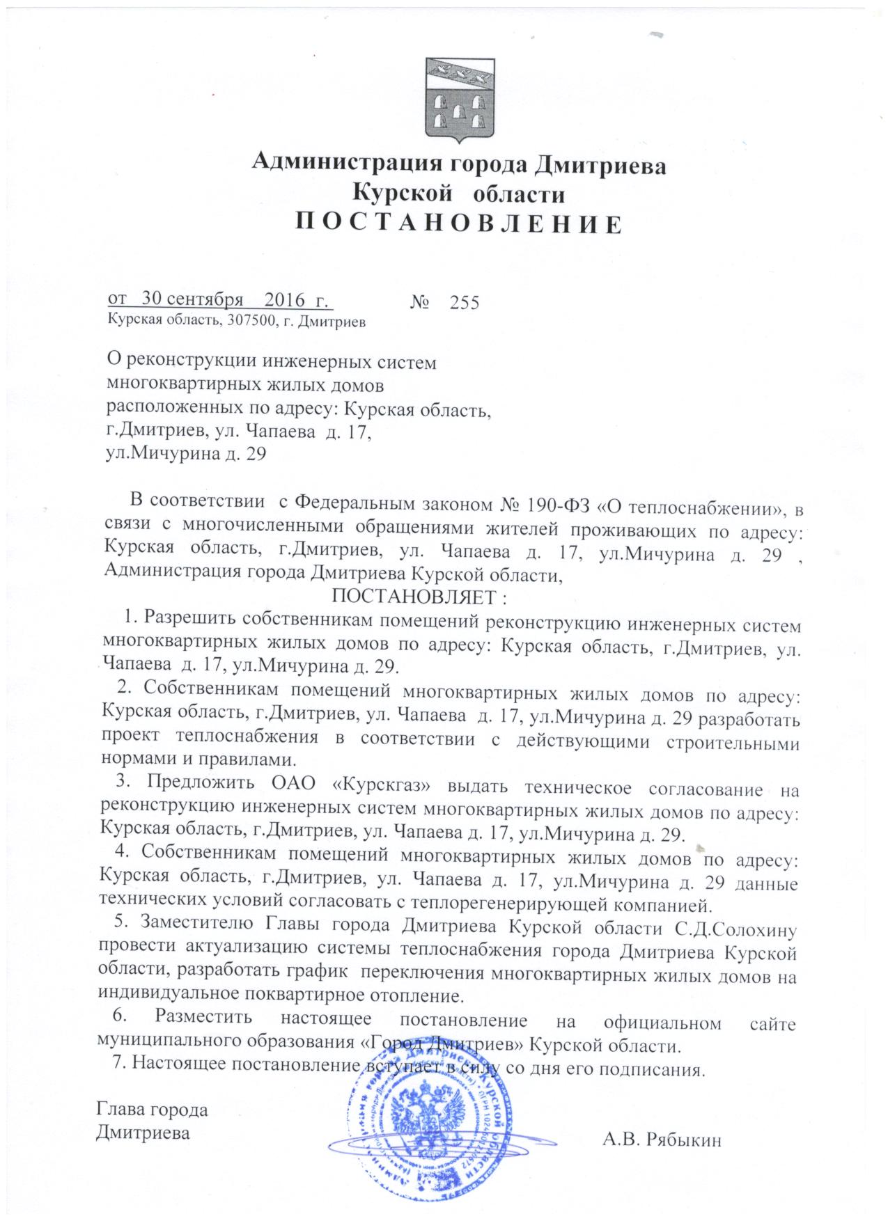 от 30 сентября 2016 г. № 255 Курская область. 307500, г. Дмитриев О реконструкции инженерных систем многоквартирных жилых домов расположенных по адресу: Курская область, г.Дмитриев, ул. Чапаева д. 17, ул.Мичурина д. 29 |